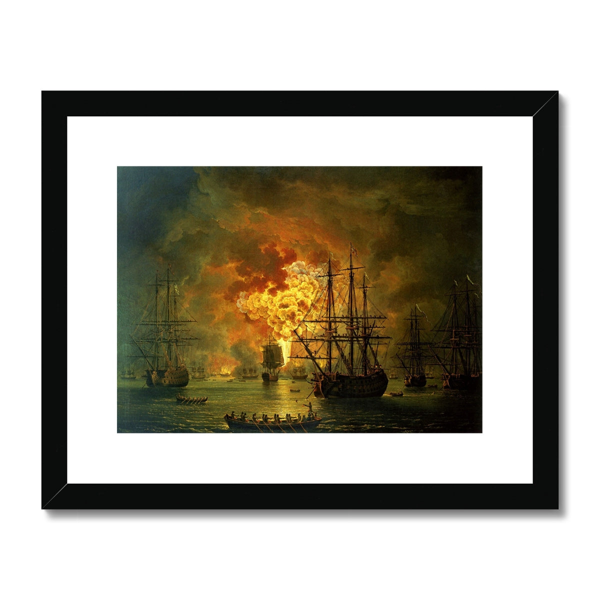 The Destruction of the Turkish Fleet in the Bay of Çeşme (Battle of Çeşme) was a dramatic naval climax of the Russo-Turkish War of 1768–1774, fought between 5–7 July 1770 in the Aegean Sea near the Ottoman port of Çeşme on the western coast of Anatolia. A Russian squadron under Count Alexei Grigoryevich Orlov and Admiral Grigory Spiridov, though outnumbered by the larger Ottoman fleet commanded by Mandalzade Hüsameddin Pasha, aggressively engaged the Turks, forcing them to anchor in tight formation within Çeşme Bay—where their cramped defensive line and proximity to shore batteries were expected to offer protection. Russian commanders, recognizing the fleet’s vulnerability, planned a bold night assault: they deployed fireships—vessels loaded with combustibles designed to drift into enemy ranks and ignite them—which, aided by favorable winds, were driven into the congested Ottoman line. The resulting inferno rapidly engulfed the Turkish warships; magazines exploded, fires spread from hull to hull, and confounded sailors either perished in the flames or drowned trying to reach the shore. By 7 July, virtually the entire Ottoman Mediterranean squadron—comprising fifteen ships of the line, six frigates, and dozens of smaller craft—had been destroyed or captured, with thousands of Ottoman sailors killed, while Russian losses were minimal. The obliteration of the Ottoman fleet not only secured Russian dominance in the Aegean for the remainder of the campaign but also dealt a profound blow to Ottoman naval power and prestige.