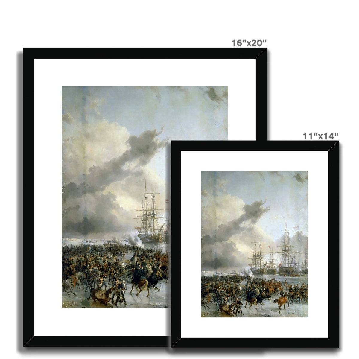Painted in 1836 by Charles Louis Mozin, "The French Cavalry Take the Battle Fleet Caught in the Ice in the Waters of Texel, 21 January 1795" commemorates one of the most unusual episodes of the French Revolutionary Wars. During an exceptionally severe winter, a Dutch fleet lay frozen and immobilized in the icy waters near Texel in the Netherlands. Taking advantage of this extraordinary circumstance, French cavalry and supporting troops advanced across the ice and forced the helpless ships to surrender—an almost unique event in military history, in which mounted soldiers captured a naval fleet. Mozin’s composition emphasizes the surreal meeting of land and sea warfare, with horsemen, artillery, and infantry moving across the frozen surface toward the towering ships, transforming this remarkable historical incident into a dramatic and monumental vision of winter, war, and revolutionary victory.