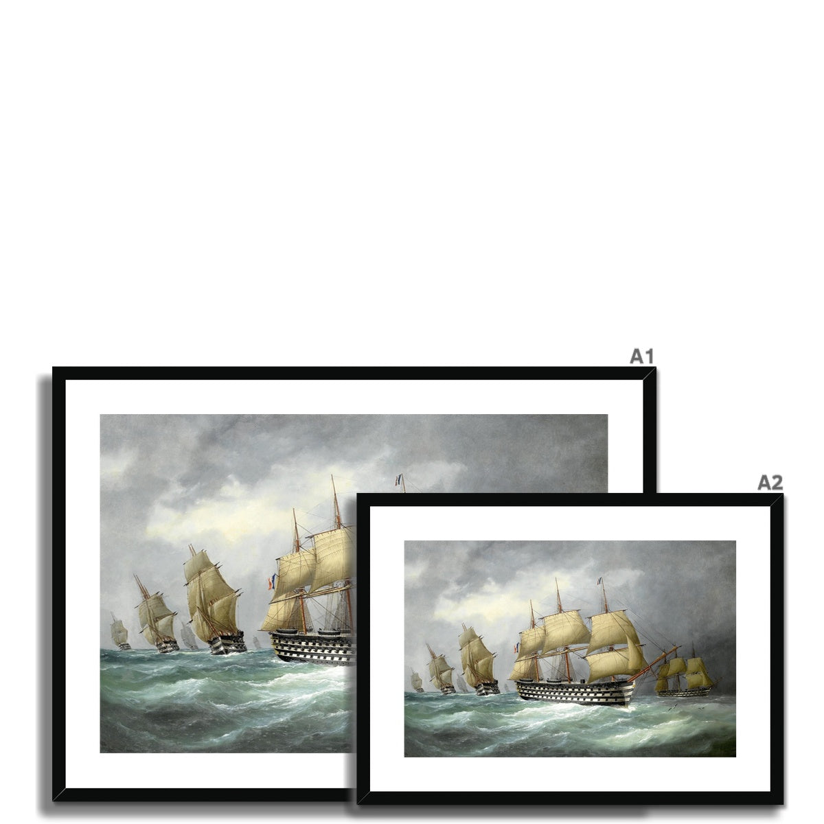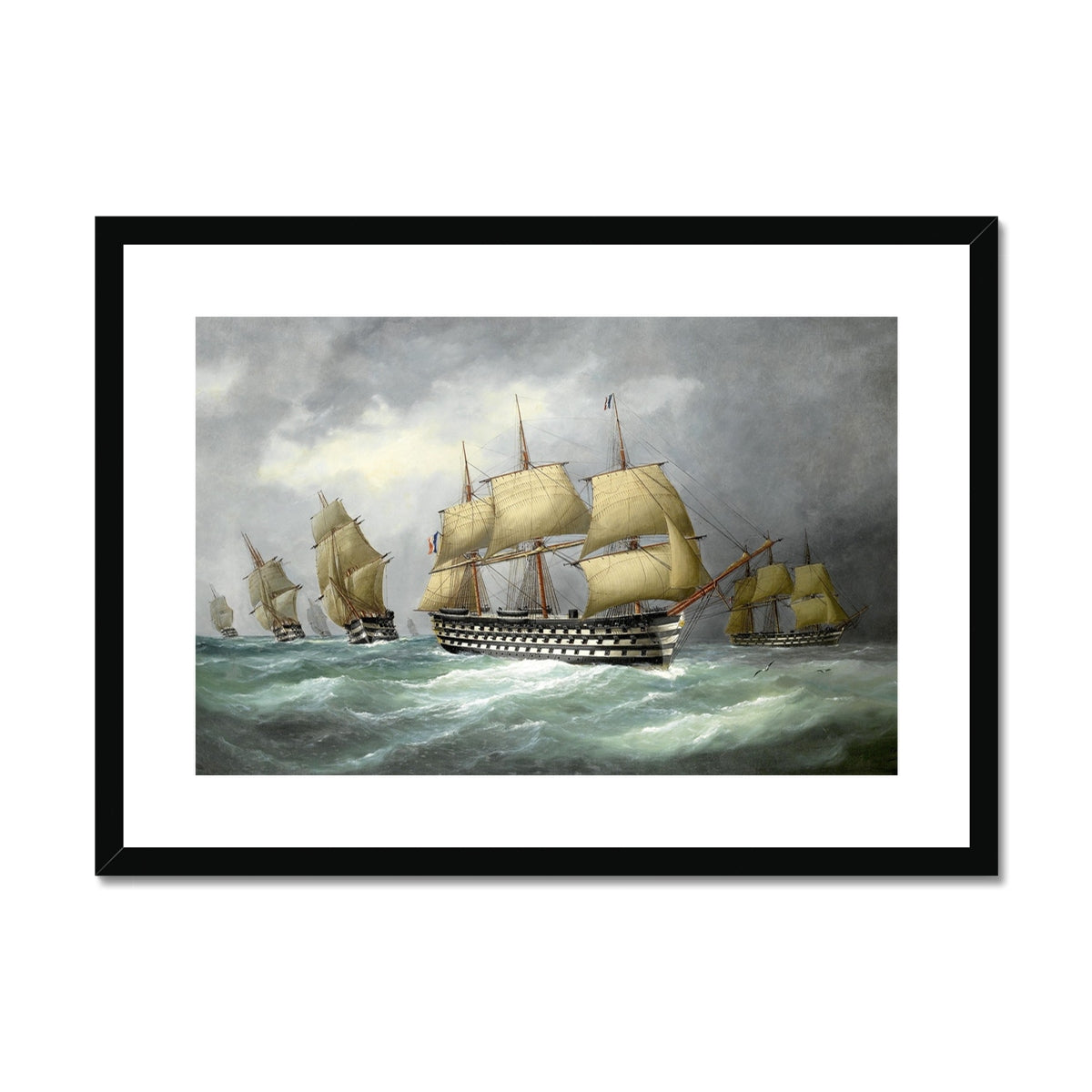 Édouard Adam’s "The First French Steam Battlefleet in Formation at Sea" (1884) depicts a powerful line of French warships cutting through churning waves beneath a brooding sky. Their sails are still set despite the age of steam, capturing a transitional moment in naval history when traditional sailing ships coexisted with modern technology. The orderly formation, taut rigging, and swelling seas emphasize discipline, strength, and the growing might of France’s 19th century navy.